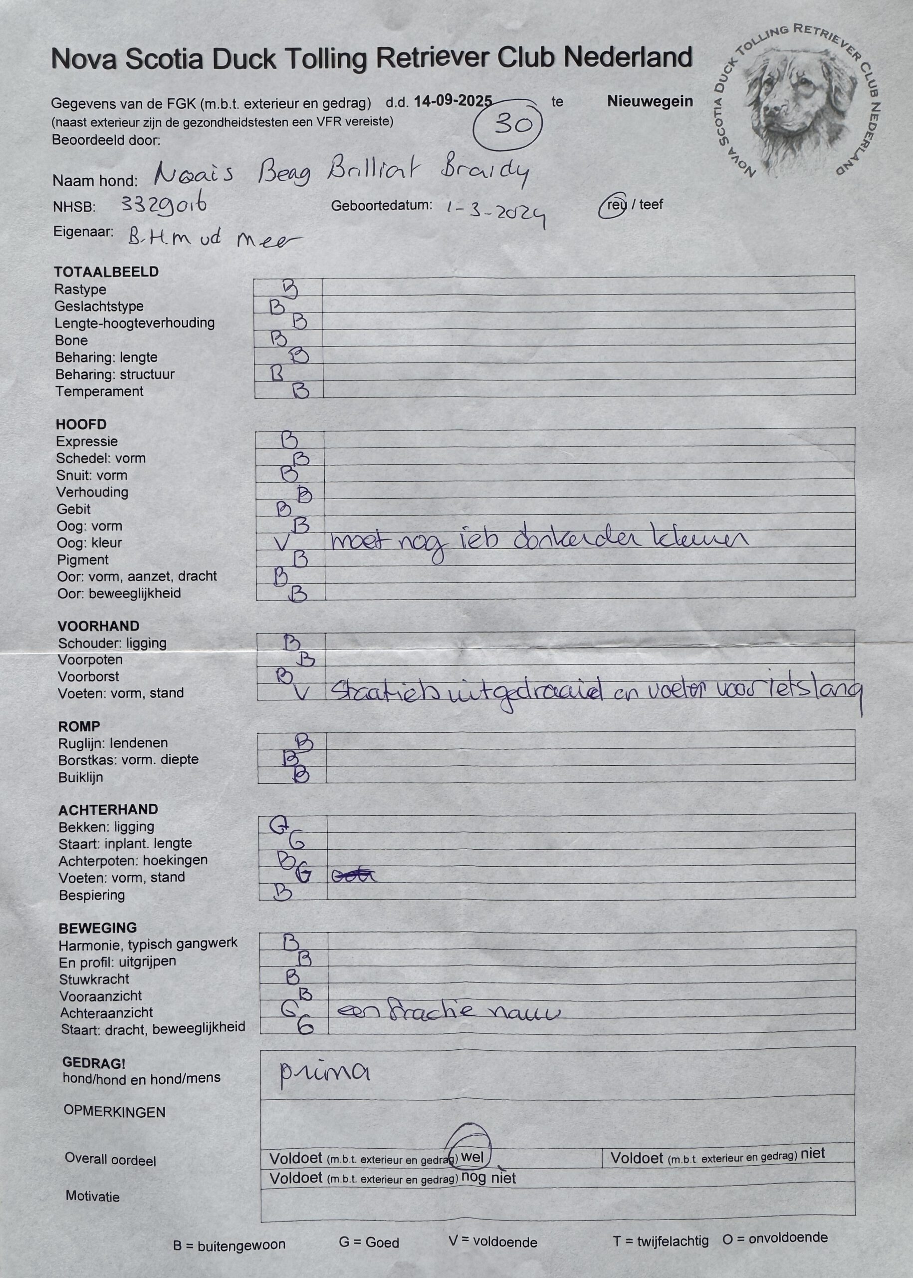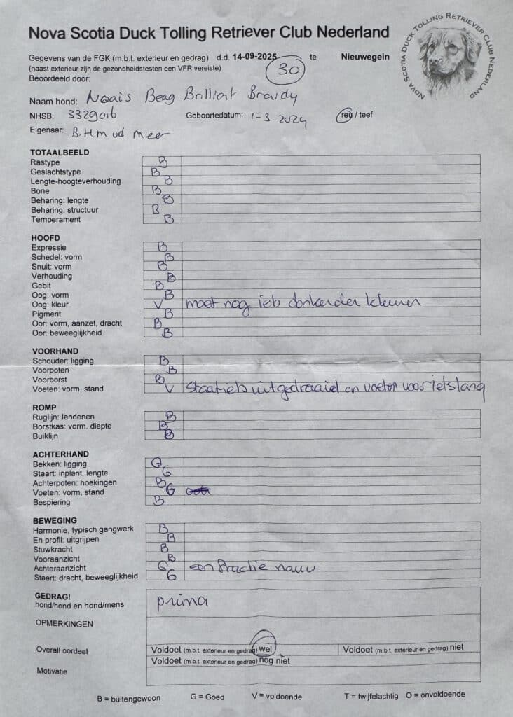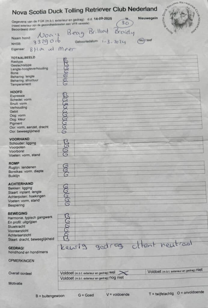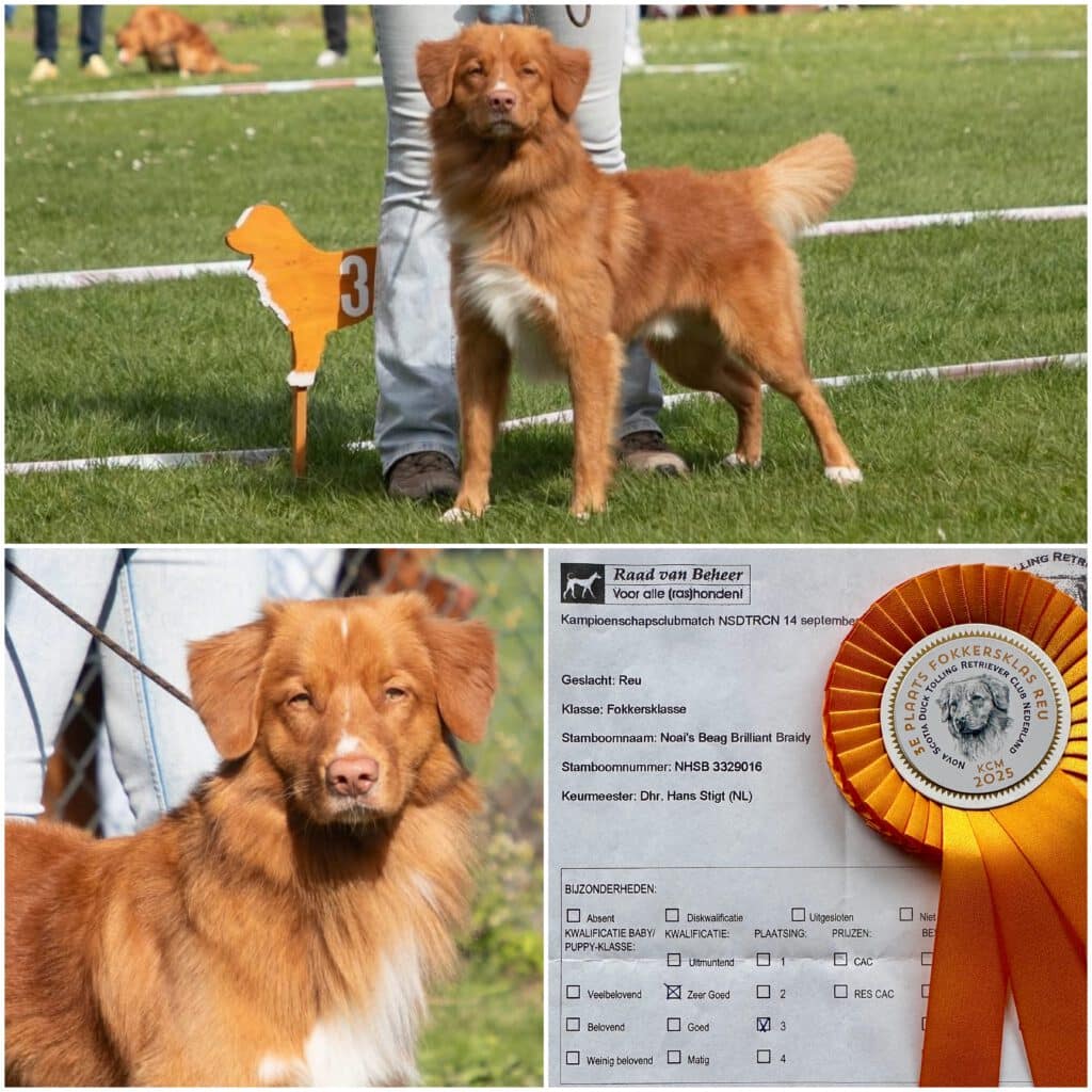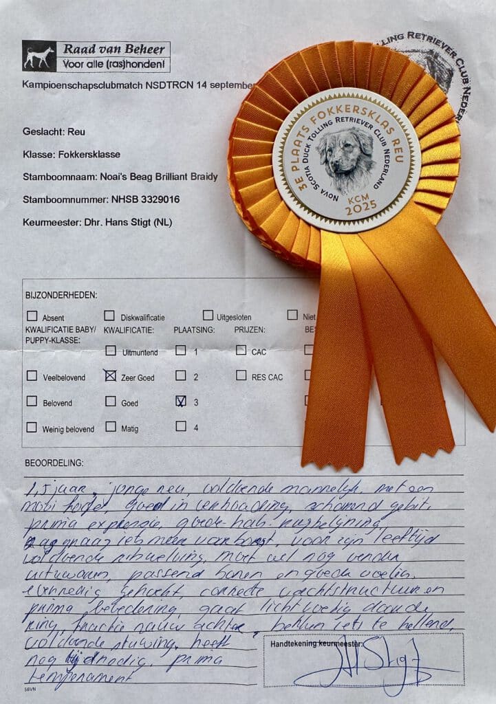 Sunny’s gezondheidsuitslagen staan hieronder en op NSDTR – The Breed Archive. Op 14 september 2025 heeft Sunny meegedaan aan de KCM van de Tollervereniging en heeft hij 2x een fokgeschiktheid gekregen (met erg mooie complimenten van beide keurmeesters). Daarnaast behaalde Sunny de 3de plaats in de ring met een Zeer Goed, waarbij de keurmeester aangaf dat hij nog wat tijd nodig heeft om uit te groeien. Dat gaat goed komen, weten we van zijn vader Dune. Op z’n leeftijd na voldoet Sunny nu aan het verenigingsfokreglement om als dekreu ingezet te worden😊 In maart 2026 gaan we de jaarlijkse ECVO oogtest weer laten doen en daarna vragen wij de fokaangelegenheidscommissie om Sunny toe te voegen aan de dekreuenlijst.
